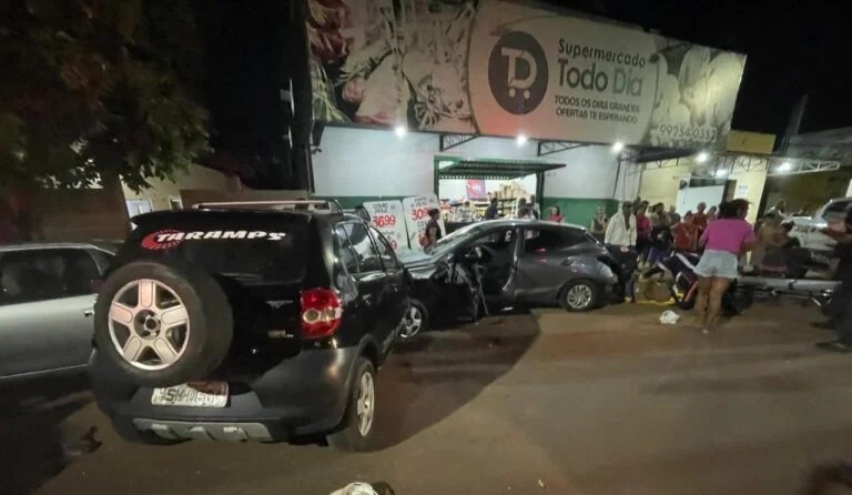 “Eu tinha feito compras no mercado e, quando fui entrar no meu carro, percebi esse carro vindo para cima de mim. Graças a Deus consegui escapar para não morrer atropelada!” – disse a dona do HB20, que teve seu carro atingido.