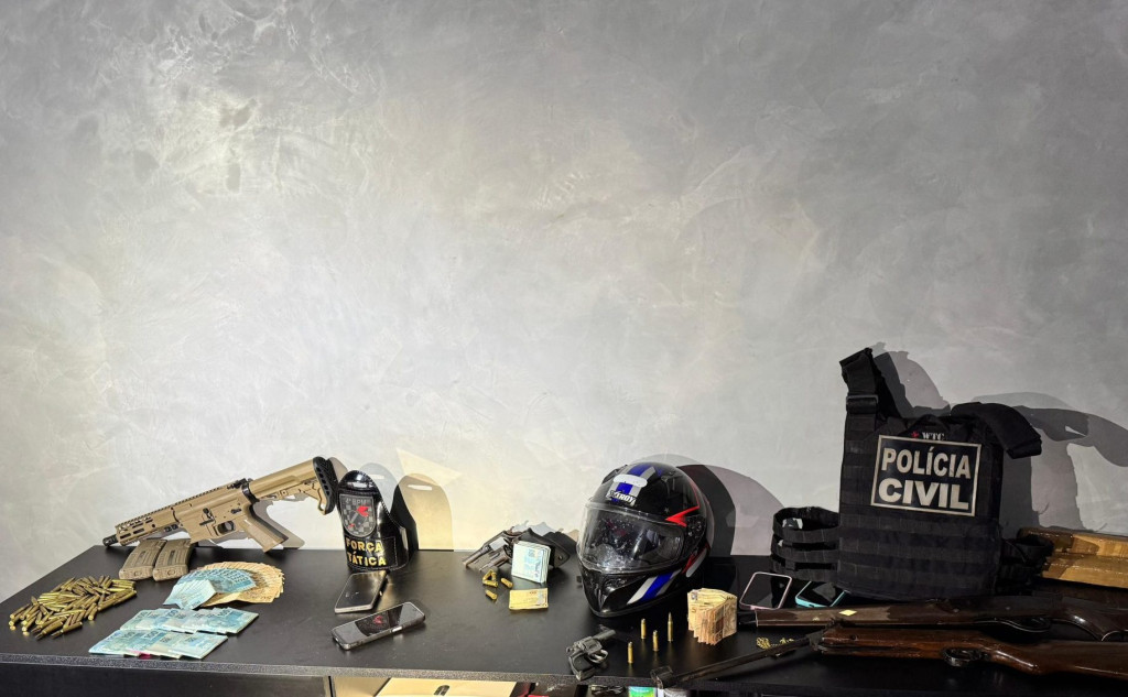 Ao cumprir os mandados de busca e apreensão e de prisão temporária decretados pela Justiça, a polícia apreendeu munições, parte do dinheiro roubado, porções de droga e as armas utilizadas no assalto, entre as quais um fuzil Colt calibre 5,56.