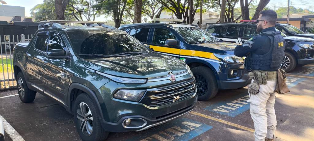 A Polícia Rodoviária Federal (PRF) prendeu um casal na tarde desta quinta-feira (21) durante fiscalização no trevo de acesso ao município de Laguna Carapã, na BR-463. Eles estavam em uma Fiat Toro verde com placa adulterada.