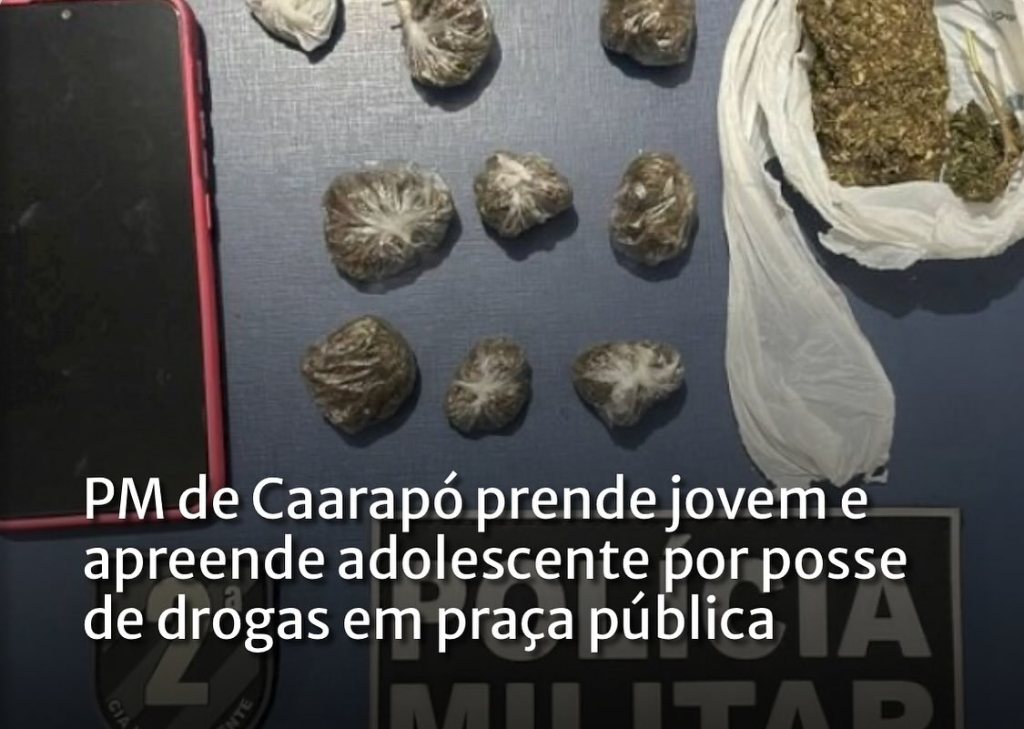 A Polícia Militar de Caarapó prendeu na tarde desta quinta-feira (2) um jovem de 18 anos e apreendeu um adolescente por posse de drogas. A ação aconteceu após denúncia de que indivíduos estariam consumindo entorpecentes na Praça Vival dos Ypês, região da Avenida Afonso Pena com a Rua Capitão Vigário.