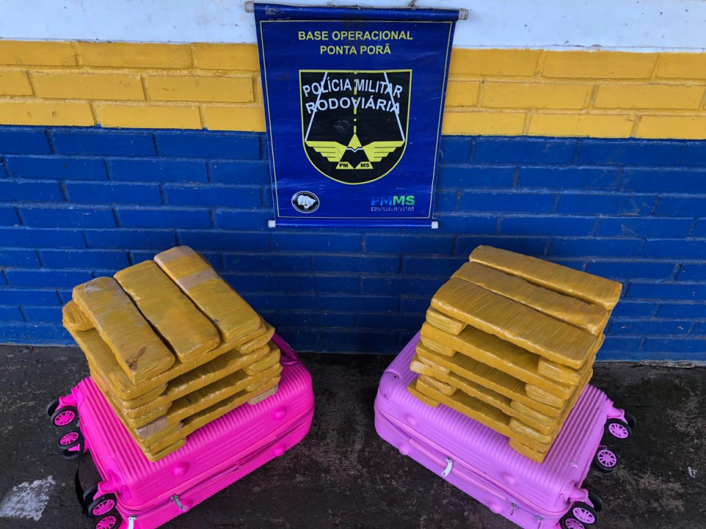 Durante a inspeção no bagageiro, os policiais sentiram forte odor característico de maconha proveniente de duas malas de cor rosa. Ao verificarem o conteúdo, localizaram diversos tabletes da droga.