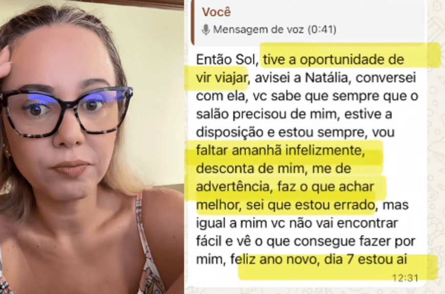 Marysol Almeida, dona de um salão de beleza em Campo Grande, foi surpreendida pela mensagem, digamos, corajosa de um funcionário que saiu de recesso para viajar e decidiu comunicá-la apenas após a ida. Conforme a empresária, o trabalhador, registrado em carteira assinada, decidiu que iria tirar um recesso de ano-novo para viajar, bem no dia que ela mais precisava de seus serviços. A ‘audácia’ do … Continuar lendo No estilo ‘só se vive uma vez’ CLT se dá ‘recesso’ sem avisar chefia e é demitido em MS