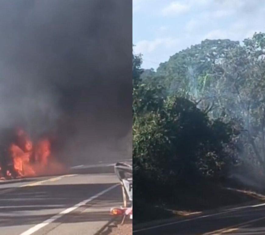 Nioaque Caminhão é consumido por fogo e fumaça encobre BR-060